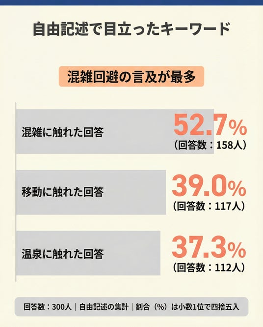 理想の過ごし方(自由記述)をみると、混雑に触れた回答が52.7%(158人)あり、渋滞や人混みを避けたい気持ちが強いことがうかがえます。