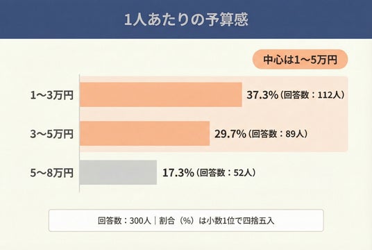 ・予算感(1人あたり)は1~3万円37.3%(112人)、3~5万円29.7%(89人)