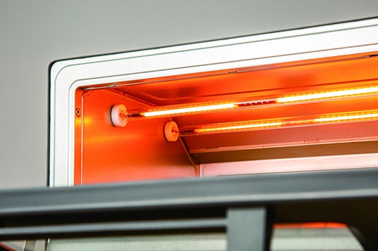 庫内上側に2本のフラッシュヒーター、庫内下側に2本の石英管ヒーターを搭載し、庫内の温度を一気に上げます。ヒーターの発熱箇所を最適化しているので、全面をムラなく短時間で加熱できます。庫内温度を100℃~260℃の範囲で調整できるので、トースト以外の調理でも活躍します。