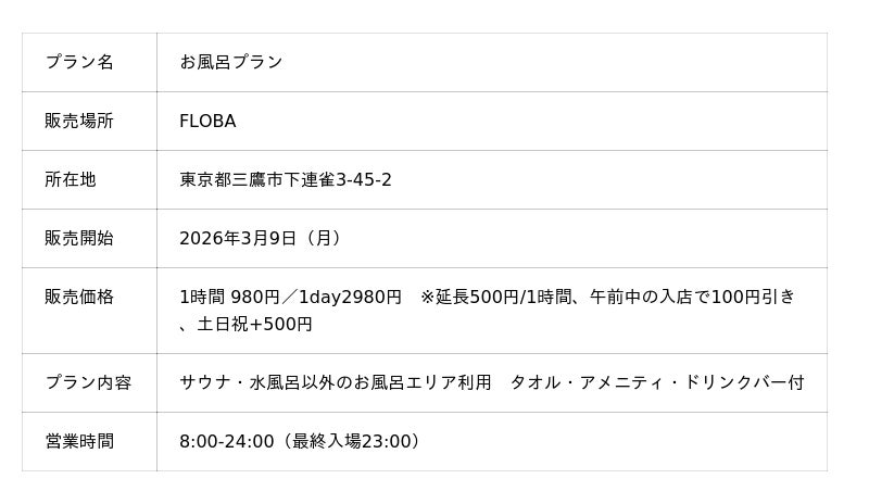 居場所事業、エンターテイメント事業を展開する株式会社メッセプロパティー(本社:東京都港区、代表取締役:宮本 茂)が運営するサウナ・スパ施設「FLOBA」は、2026年3月9日(月)より、入浴に特化した新サービス「お風呂プラン」を開始します。