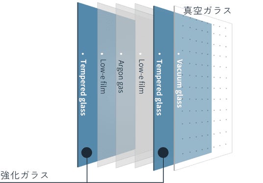 ガラス扉には、断熱性と遮熱性に優れた「Low-Eガラス」と、熱伝導を抑えて結露を防ぐ「真空ガラス」を組み合わせた4層構造を採用しています。