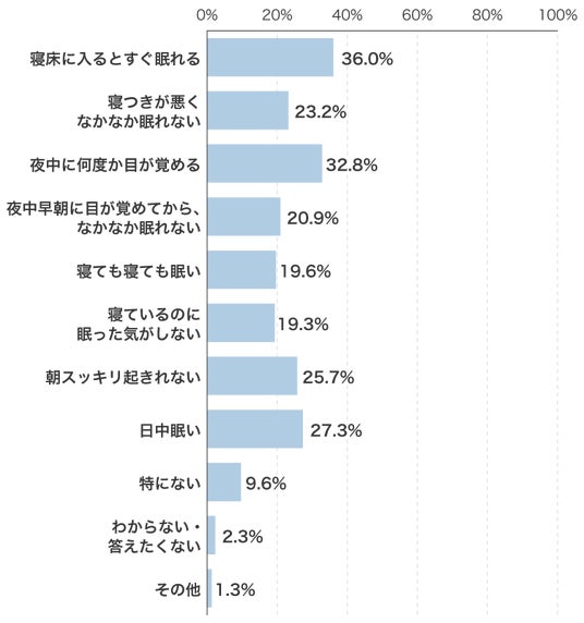 睡眠状態について複数回答でお尋ねしました。すぐ眠れる方はおよそ3人にひとり。3人に2人が何らかの悩みを抱えていることがわかりました。