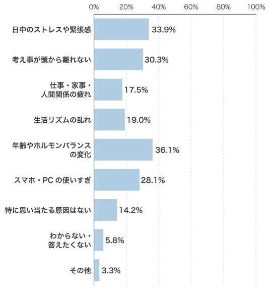 日中のストレスや緊張感、考えごとなどメンタルに関する原因をあげる人も多く、単純に「眠りを誘う」だけのサポートでは、快眠にはつながらないのではないかと分析できます。