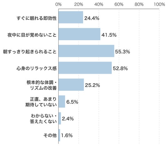 「朝すっきり起きられること」、「心身のリラックス」への期待が5割をこえました。すぐ眠れる即効性は予想を下回り4人に一人にとどまりました。