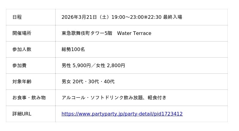 国内最多*¹の成婚数を誇る株式会社IBJ(代表取締役社長:石坂 茂、本社:東京都新宿区、東証プライム:6071、以下「IBJ」)が運営する婚活パーティーサービス「IBJ Matching」は、2026年3月21日(土)に東急歌舞伎町タワー5階「Water Terrace」にて、総勢100名規模の「恋活ナイトパーティー」を開催します。
