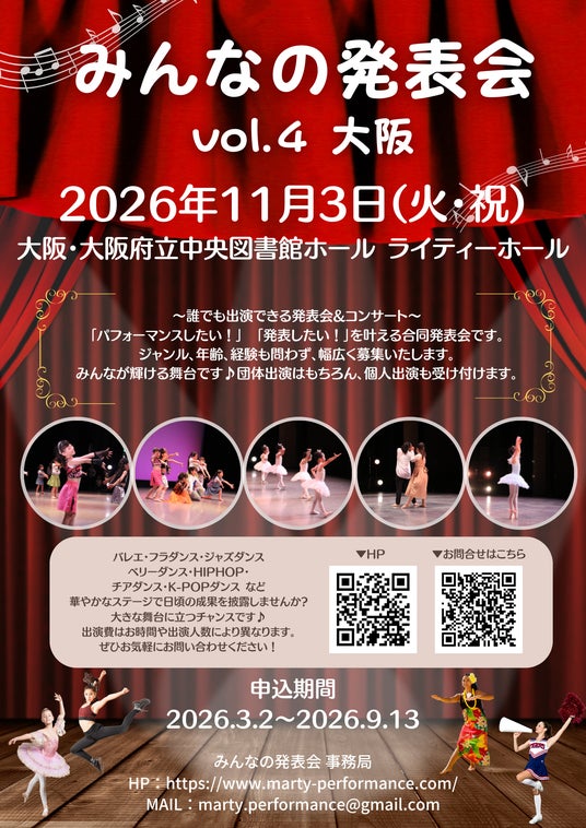バレエ・ダンス用品のマーティ株式会社は、昨年も好評を得た舞台「みんなの発表会」を2026年11月3日(火・祝)に開催します。このイベントは「多様なダンスジャンルが集結する楽しい舞台!」をテーマに、日ごろから練習に励んでいる地域のお教室・生徒様を対象にしたものです。年齢や性別・ダンスジャンルに関わらず、どなた様でもご参加いただき、日ごろの成果発表の場として活用いただける舞台です。