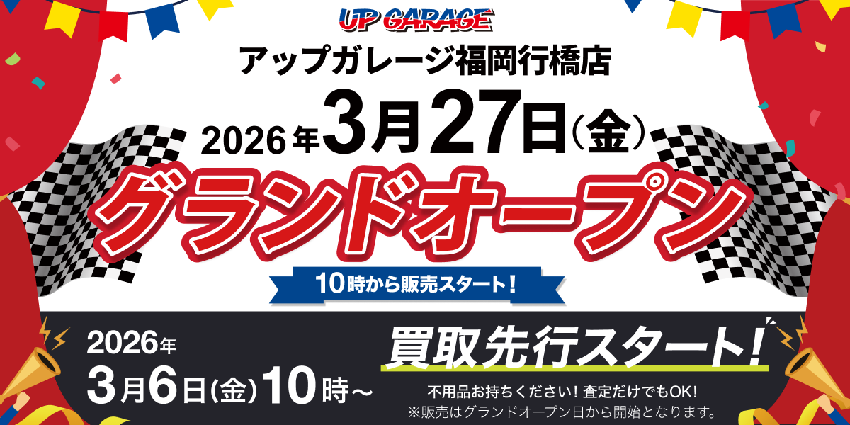 カー&バイク用品のリユース専門店「アップガレージ」を全国展開する株式会社アップガレージグループ(本社:神奈川県横浜市、代表取締役社長:河野映彦、東証スタンダード市場:7134)は、2026年3月27日(金)に、フランチャイズ店の「アップガレージ福岡行橋店」、併設店として「アップガレージライダース福岡行橋店」、「タイヤ流通センターアップガレージ福岡行橋店」を新規出店いたします。