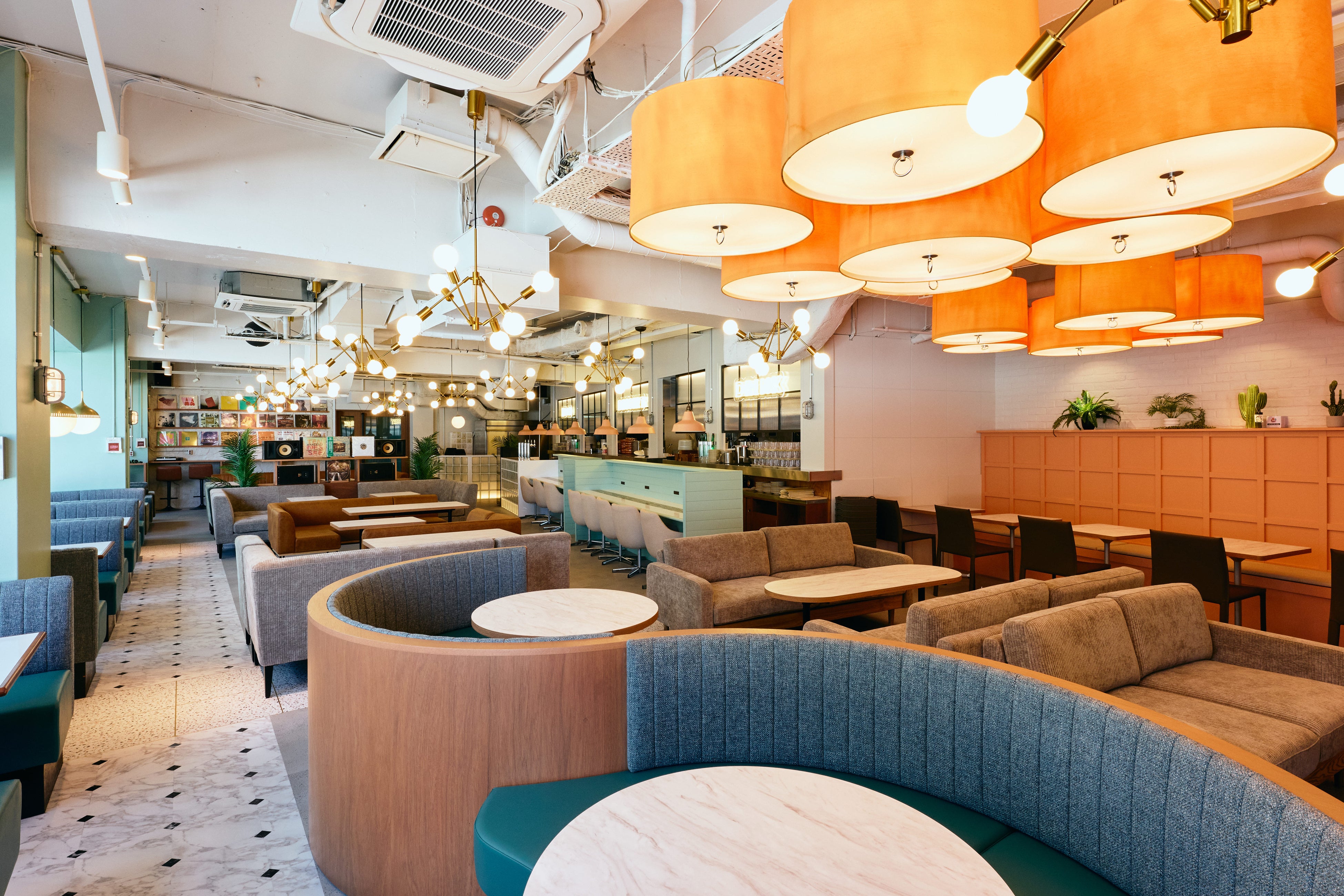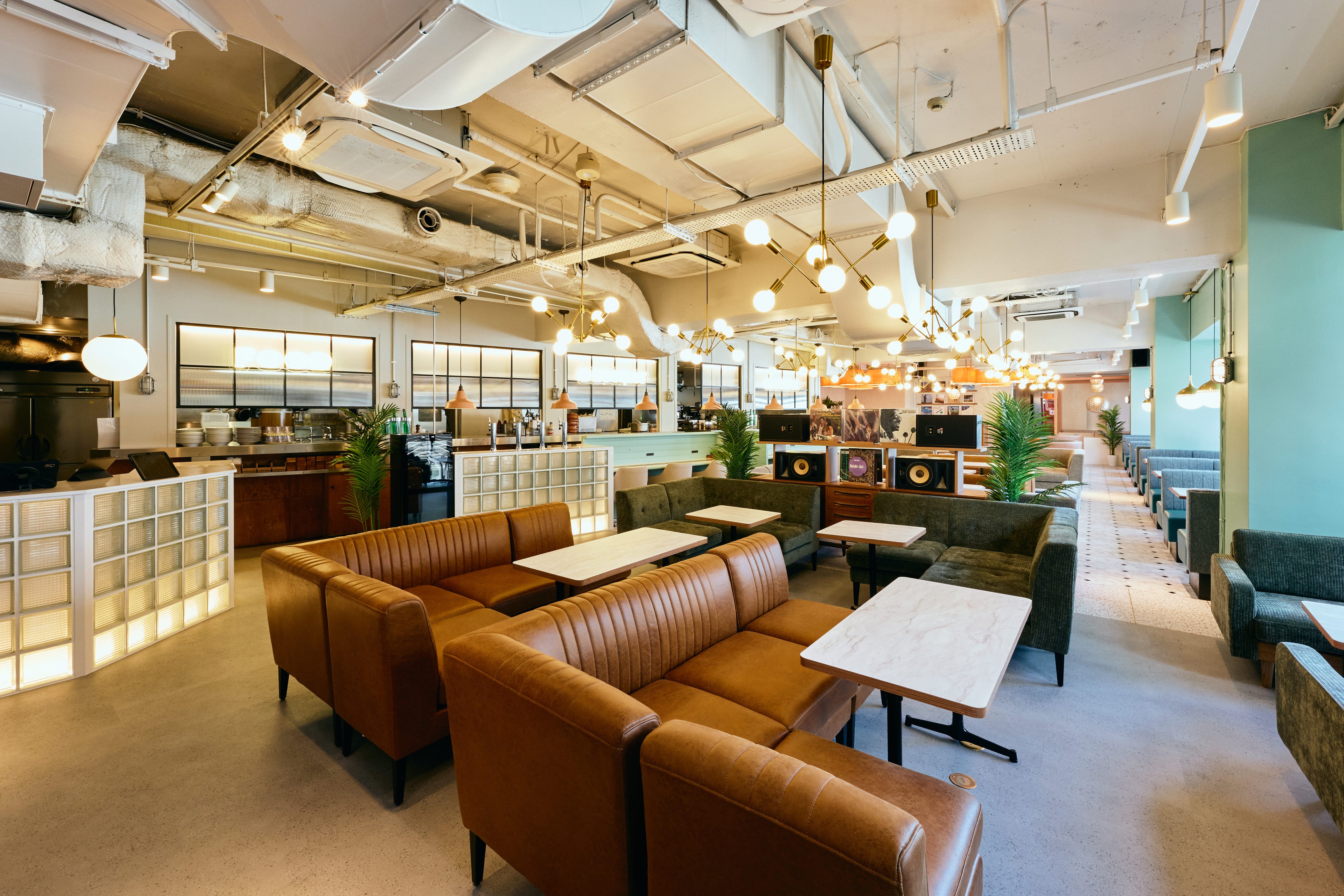 新しいMOJAは、きれいめカジュアルで上質感のある知的なカフェ空間。アーチが連なる格子窓やグリーンの柱、ネオンサインが目を引く明るい外観が街に開かれた存在感をつくります。店内にはテラス席やレコードカウンター、ラウンジソファ、ビジネスカウンターなど多彩な座席を配置。グリーンやターコイズなどのくすみパステルトーンと天然木やガラス素材が調和し、都会の中で心地よく過ごせる活気ある空間を演出します。