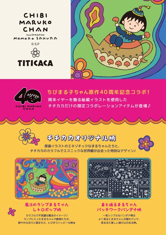 世界中の文化をとり入れた遊び心あふれるカラフルなデザインで衣料品、服飾雑貨と生活雑貨の企画・販売を展開している株式会社チチカカ(本社:東京都港区、代表取締役社長:藤井耕治)(以下、チチカカ)は、国民的作品『ちびまる子ちゃん』 原作40周年を記念し、特別なコラボレーションアイテムを2026年3月20日(金・祝)に店頭発売予定です。