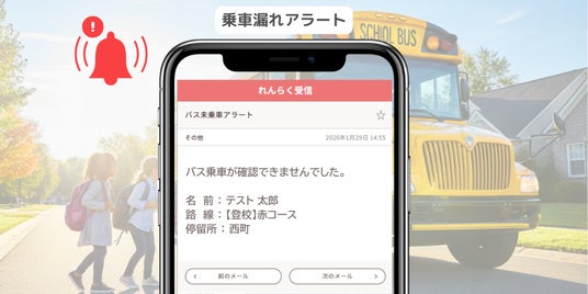 - アナログ管理との比較:従来の名簿確認では、学校に到着して照合するまで「欠席」か「乗り漏れ」かの判断が困難でした。また、万が一車内で乗り遅れや異変に気づいたとしても、バス乗務員が即座に保護者や学校へ連絡を入れることは運用上難しく、タイムラグが生じがちです。本機能の活用で、より早い段階で異常を察知し、保護者や関係者へ通知します。