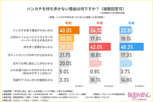 ブルーミング中西株式会社(所在地:東京都中央区、取締役社長:中西 一)は、1.昭和/2.平成/3.令和時代に20代だった方を対象に、「世代別に見る、身だしなみ意識とハンカチ携帯」に関する比較調査を行いました。
