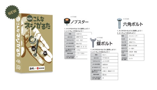 登場するのは、六角ボルトや蝶ボルトなど、実際に世界で使われているネジたち。カードには「サイズ」「使う場所」「よくある失敗」などが記載されており、遊びながら自然とネジに詳しくなります。
