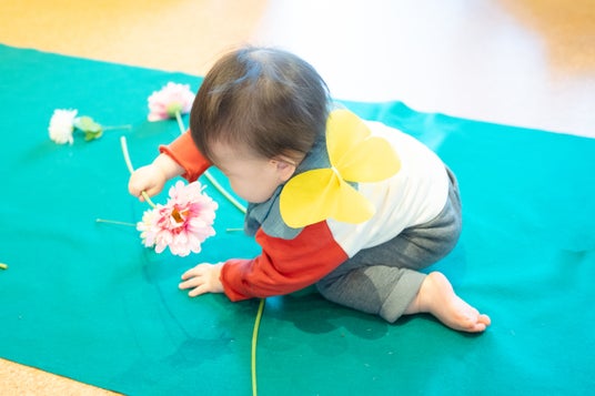 PLAY! PARKの入場特典でもらえるお揃いの「ちょうちょの羽」を背中につけて参加する、ハイハイレースです。緑のカーペットの上を進むコースには、たくさんの花が散りばめられ、原っぱをお散歩しているような世界が広がります。鈴付きの花に触れて音を鳴らしながら、親子で協力してゴールを目指します。