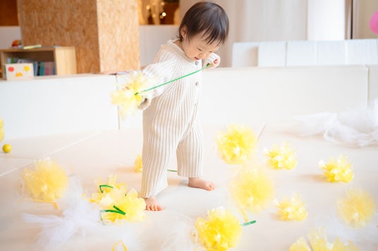 一面に広がる、やわらかな“たんぽぽ畑”が登場します。黄色い平テープでできたタンポポや、ふわふわのチュール素材の綿毛が宙に舞います。タンポポの茎部分にはゴム風船がついているので、親子で飛ばして遊べます。カサカサ、ふわふわ、素材の違いによる触感あそびに加え、天然アロマによる明るくフルーティーな香りが空間を包み込みます。視覚・触覚・嗅覚で楽しむ、赤ちゃんのための春体験です。
