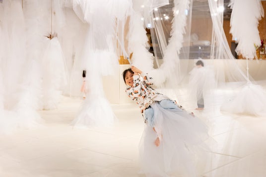 空間の中心に広がる楕円型フィールド〈大きなお皿〉に現在登場しているのは、透け感のあるチュール生地と伸縮性のあるゴムを組み合わせた大型遊具「チュール雲」です。チュールのかたまりに乗って引っ張られたり、かくれんぼをしたり、ロープにまたがってターザンのように揺れたり、遊び方は無限大です。