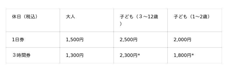 [団体割引]子ども15名以上の利用は団体扱い。大人900円、子ども(3~12歳):1,700円 / 子ども(1~2歳)1,200円。貸切利用も可能です
