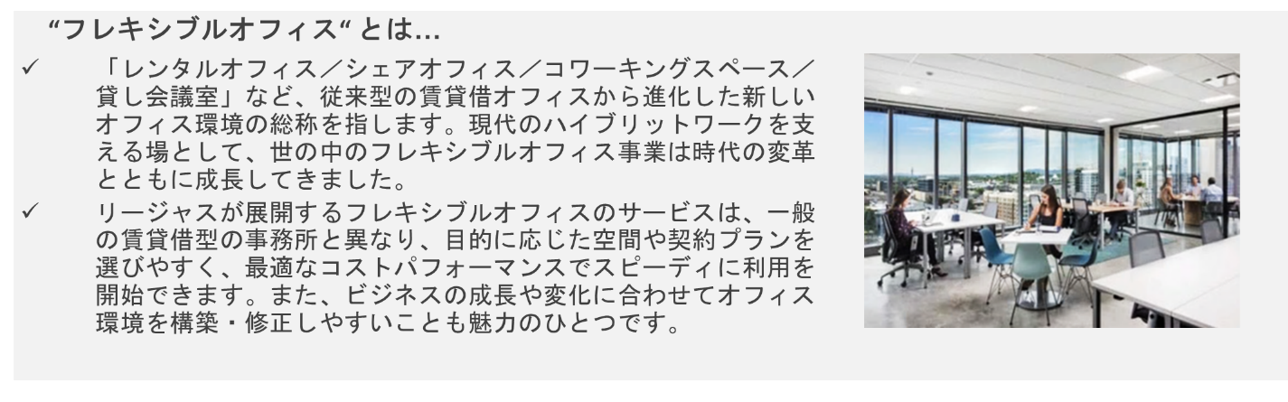 洗練された空間を提供する大人のコワーキング「Signature(シグネチャー)」、創造的なコラボレーションを実現する「SPACES(スペーシズ)」、 上質なワークスペース、多彩なロケーション、柔軟なプランを提供する「Regus(リージャス)」、“働く”をもっとシンプルに、を目指したコンパクトで機能的な「Openoffice(オープンオフィス)」の4つのブランドを運営することで、多様なお客様のニーズにフィットするフレキシブルオフィスソリューションを提供しています。