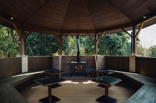 庭園内に佇むガゼボでは、夜になると薪をくべた暖炉の火を楽しむことができます。晴れた日にはウッドデッキで、コーヒーやスイーツなどの喫茶メニューを味わいながら、風や光、広がる景色とともにゆったりとした時間をお過ごしいただけます。また、ガゼボのそばには、岩肌を水が静かに伝うモニュメントを設えました。水の音や風の気配、やわらかな光が重なり合い、自然と一体になるようなひとときを感じていただける空間となっています。