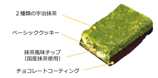 国産抹茶を使用した抹茶風味チップを配合し、濃厚な抹茶の味わいをお楽しみいただけます。宇治抹茶パウダーと抹茶風味チップの味わいが口の中で広がり、深い抹茶の余韻を楽しめます。また、ビターなチョコレートを下部のみにコーティングすることで、食べ進めるほどに抹茶の味わいが引き立ちます。