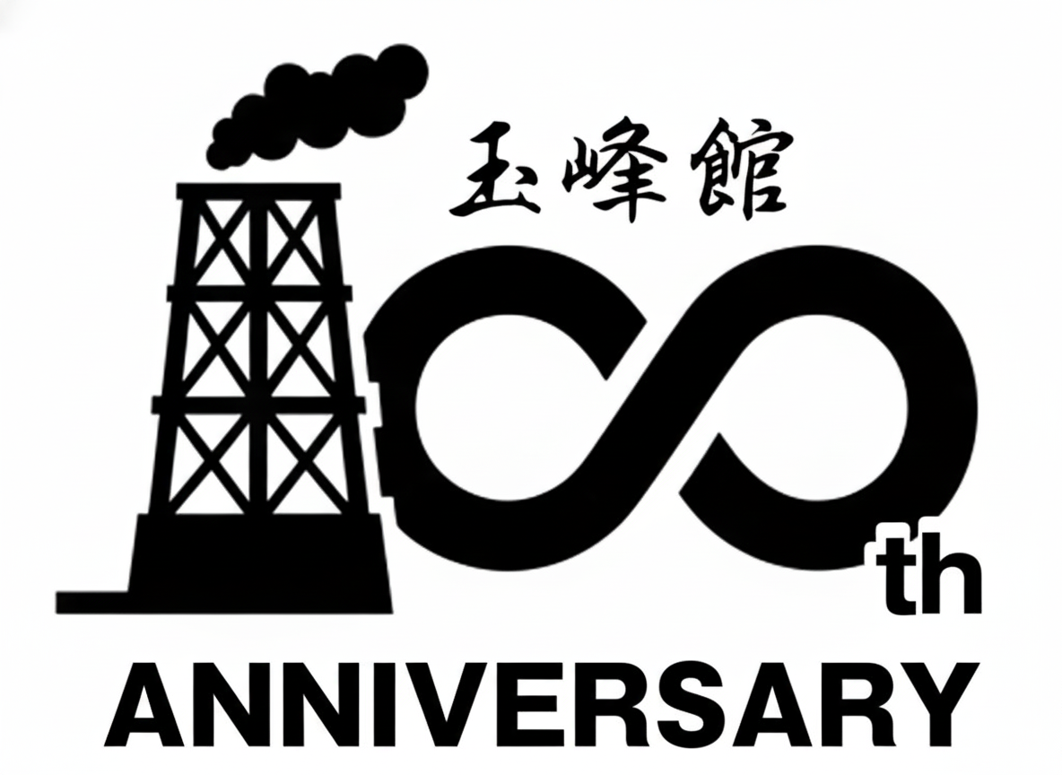 玉峰館のシンボルである湯櫓(ゆやぐら)と、これからも沢山のお客様から永く愛される旅館であり続けたいという意味を込めた無限のマークを置き、100周年を表現いたしました。