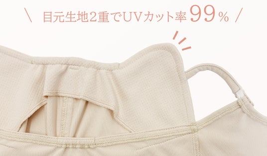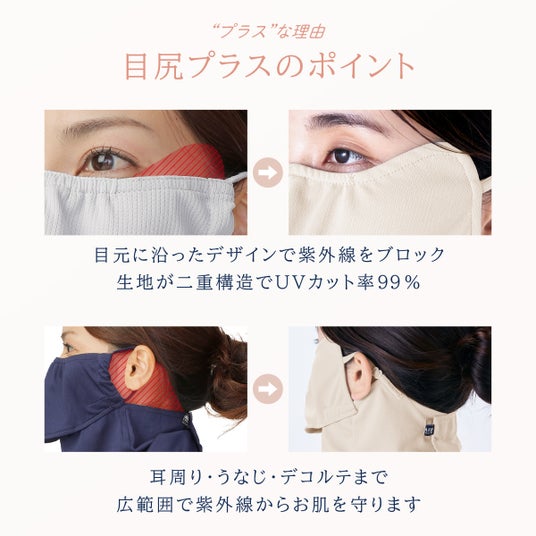 「ヤケーヌ目尻プラス」は、目元に沿う独自デザインで、目元からしっかり紫外線を防ぎたい方に最適な高機能フェイスカバーです。特に日焼けしやすい目元の内側は二重構造で、UVカット率99%。さらに、耳回りやうなじまで広範囲にカバーできるヤケーヌです。
