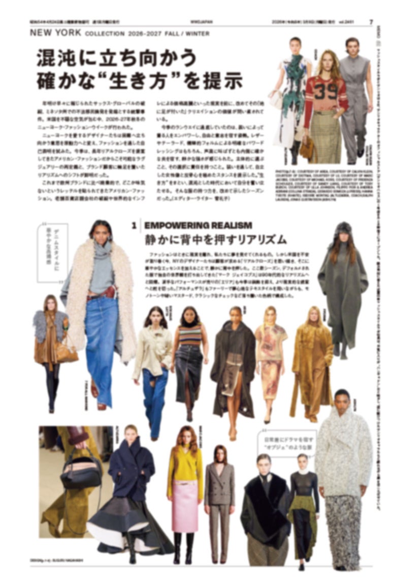 一方のニューヨークからは、今の時代を映し出す3つのスタイルキーワードが浮上しました。リアルクローズをベースに無理のない装飾を添えた「エンパワリング・リアリズム」、ビンテージへの愛を現代の視点で再定義する「リ・ヒューマナイズド・クラシックス」、そして情勢不安に対する意思表明としての「ステートメン・ドレッシング」。これらを代表的なルックとともに詳細に解説するほか、ノードストロームやバーグドルフ・グッドマンといった海外有力店バイヤーによるコレクション評も必読です。