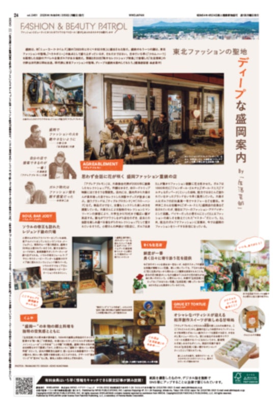 裏面「ファッション&ビューティ パトロール」は東北ファッションの聖地、盛岡が舞台。2月23日「地方セレクトショップ特集」で登場した「生活芸術」の小野公洋代表によるディープな盛岡案内をお届けします。