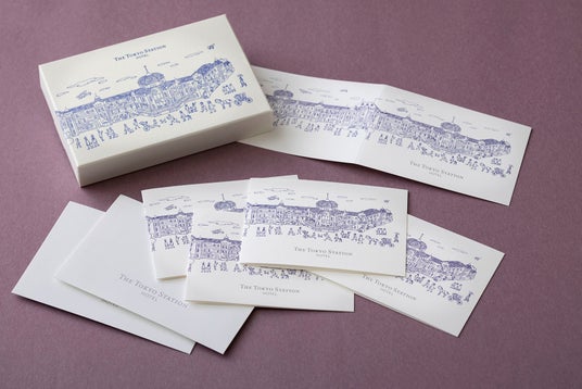 内容:駅舎が描かれたメッセージカード、小封筒×各5 枚、カードと同デザインのイラストレーションボックス(ホテル外観 南側)