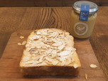 オリジナルの塩バターミルクジャムをトーストに塗り、その上にスライスアーモンドをかけた一品。アーモンドのサクサクとした食感。塩バターミルクジャムの心地良い甘さ。食パンには、デニッシュ的な食べ方もあることを改めて教えてもらった。