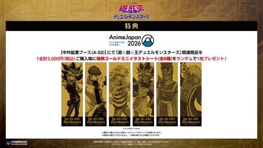 中外鉱業ブースにて『遊☆戯☆王デュエルモンスターズ』AnimeJapan 2026関連商品を1会計3,000円(税込)ご購入毎に、特典ゴールドミニイラストシート(全6種)をランダムで1枚プレゼントします。