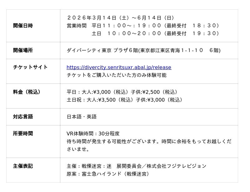 この度、戦略的提携している株式会社電通(本社:東京都港区、代表取締役 社長執行役員:佐野 傑)と株式会社フジテレビジョン(本社:東京都港区、代表取締役社長:清水賢治)と共に、2026年3月14日(土)から6月14日(日)までの期間限定で、ダイバーシティ東京 プラザ6階で『戦慄迷宮:迷』を開催することが決定いたしました。