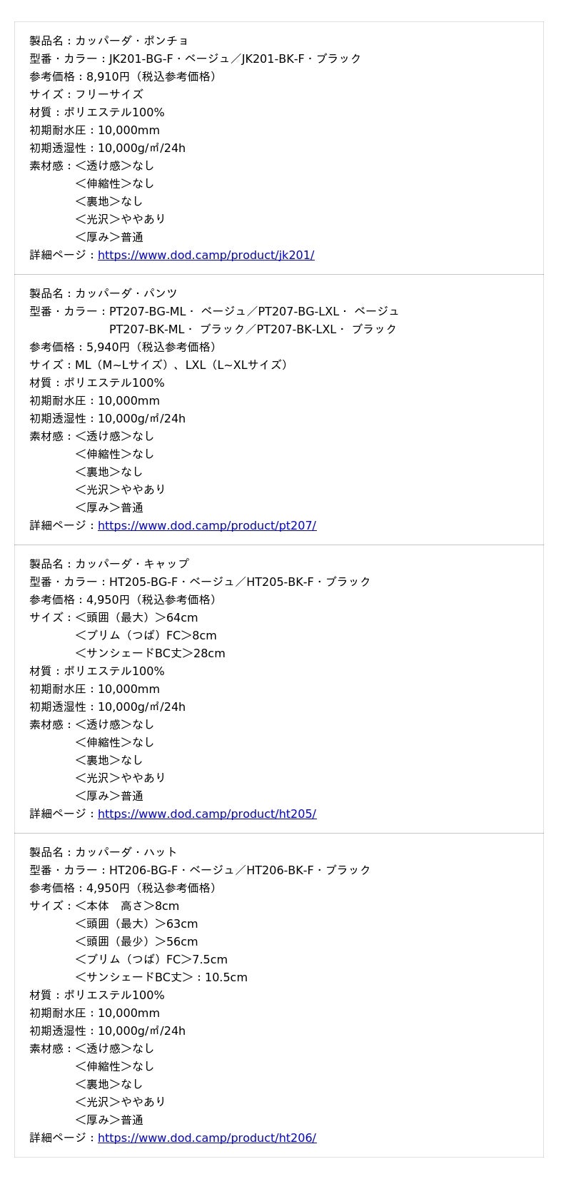「カッパーダ・ポンチョ」 https://www.dod.camp/product/jk201/