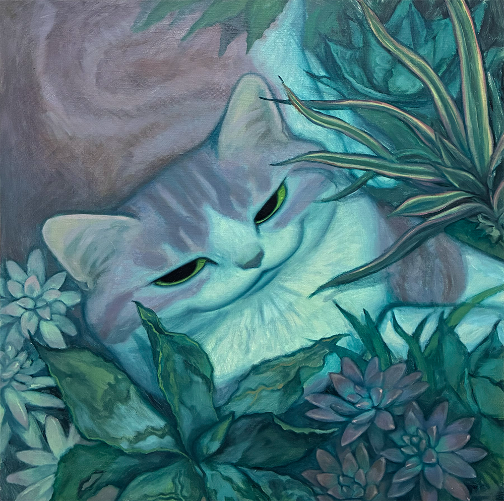 Karin Hosonoは、2002年神奈川県相模原市生まれ、2025年多摩美術大学絵画学科油画専攻 卒業。幼少期から一貫して猫を描き続けており、度重なる観察に基づいた独特のタッチを用い、「猫より猫らしい120%の猫」を目指した作品を制作しています。