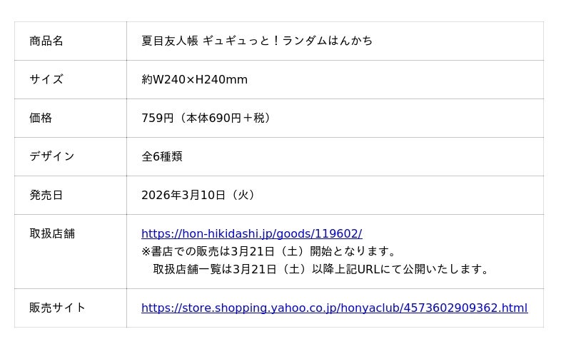 日本出版販売株式会社(代表取締役社長:富樫 建、略称:日販)は、TVアニメ「夏目友人帳」とコラボレーションし、アニメに登場する人気キャラクター“ニャンコ先生”をデザインした新商品「夏目友人帳 ギュギュっと!ランダムはんかち」を2026年3月10日(火)に発売し、全国の書店・雑貨店にて順次販売開始します。