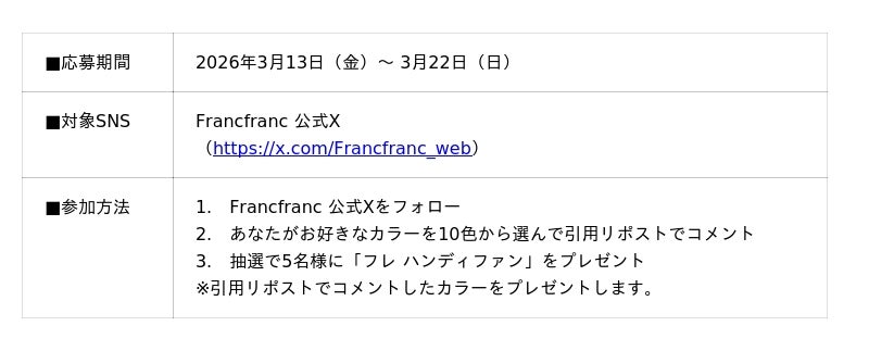 本キャンペーンでは、Francfranc公式X(Francfranc_web)をフォローのうえ、2026年3月19日(木)より発売予定の「フレ ハンディファン」全10色の中から、推しのカラーを引用リポストすることで応募が完了します。キャンペーンにご参加いただいた方の中から抽選で5名様に「フレ ハンディファン」をプレゼントします。