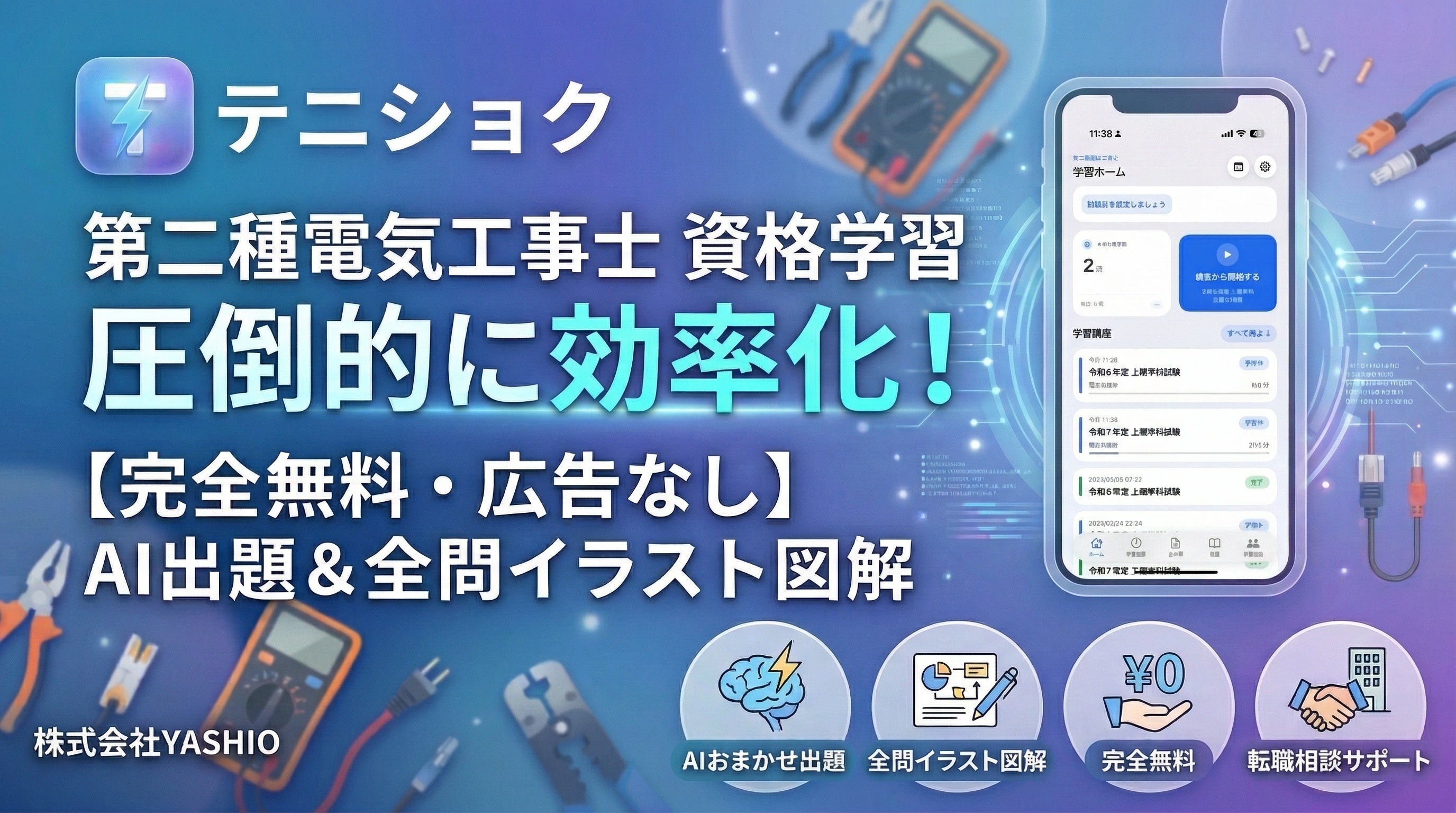 「Japan Qualityの技術を、世界の課題解決策へ。」をミッションに掲げ、AI/DX支援事業およびグローバル展開を行う株式会社YASHIO(本社:東京都中央区、代表取締役:正盛 崇稔)は、第二種電気工事士の資格取得を目指すユーザーに向け、完全無料・広告一切なしで利用できるiOS・Android対応の資格学習アプリ「テニショク」をリリースいたしました。