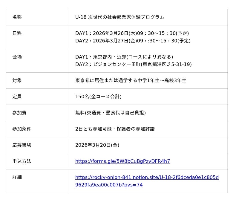 株式会社Ridilover(東京都文京区、代表取締役:安部敏樹、以下「リディラバ」)は、東京都内に居住または通学する中学生・高校生150名を対象に、社会課題の現場視察・学生起業家との対話・ビジネスプラン作成を2日間で体験する「 U-18 次世代の社会起業家体験プログラム」を2026年3月26日(木)・27日(金)に開催します。中高生が社会課題に触れる機会は増える一方、「自分も何かしたい」と思った先に踏み出せる場はまだ限られています。本プログラムは、その最初の一歩を支える取り組みです。参加費無料、3月20日(金)締切で募集中。