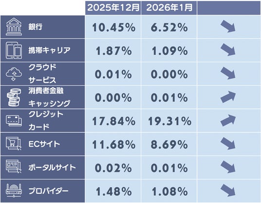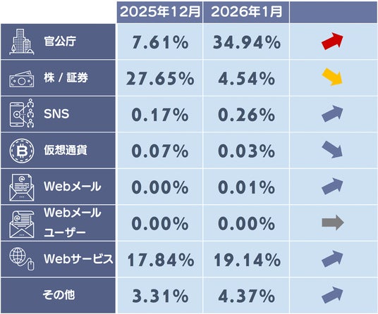 1月度は官公庁のフィッシングサイトの構成比が上昇しており、国税庁のフィッシングサイトが増加したことが要因と考えられます。また証券系のフィッシングサイトの減少により構成比が減少しています。