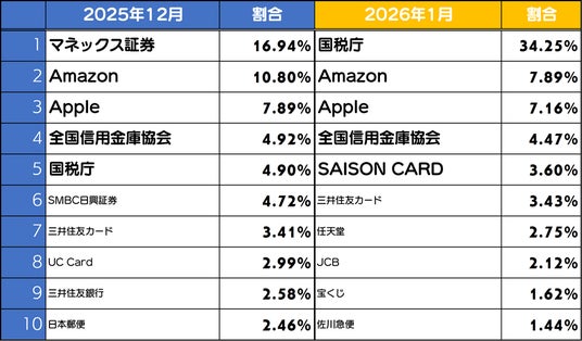 1月度は国税庁が最も多く、1位となっています。また、7位には任天堂がランクインしています。特に1月から2月にかけては、任天堂やPlayStationを装ったフィッシングサイトの増加しており、注意が必要です。