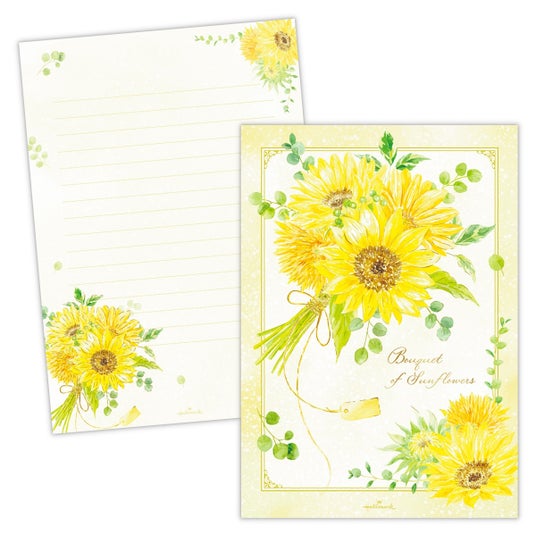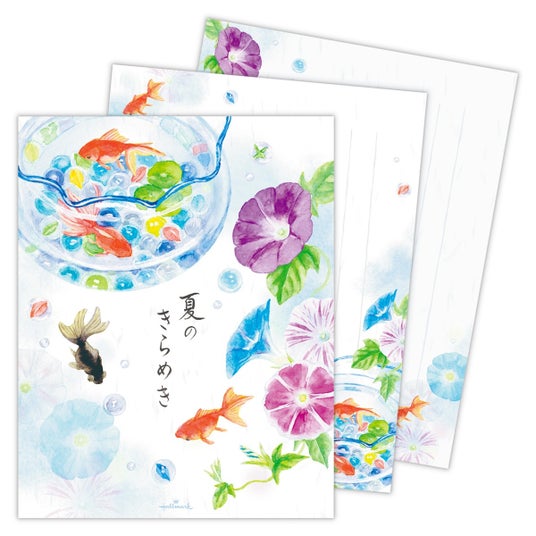 暑中見舞いや残暑見舞い、お中元など季節のご挨拶状としても人気が高い夏柄レターは、小ぶりながらも華やかなミニひまわりのブーケと、「夏のきらめき」をテーマに金魚鉢やビー玉を描いた2柄を展開。