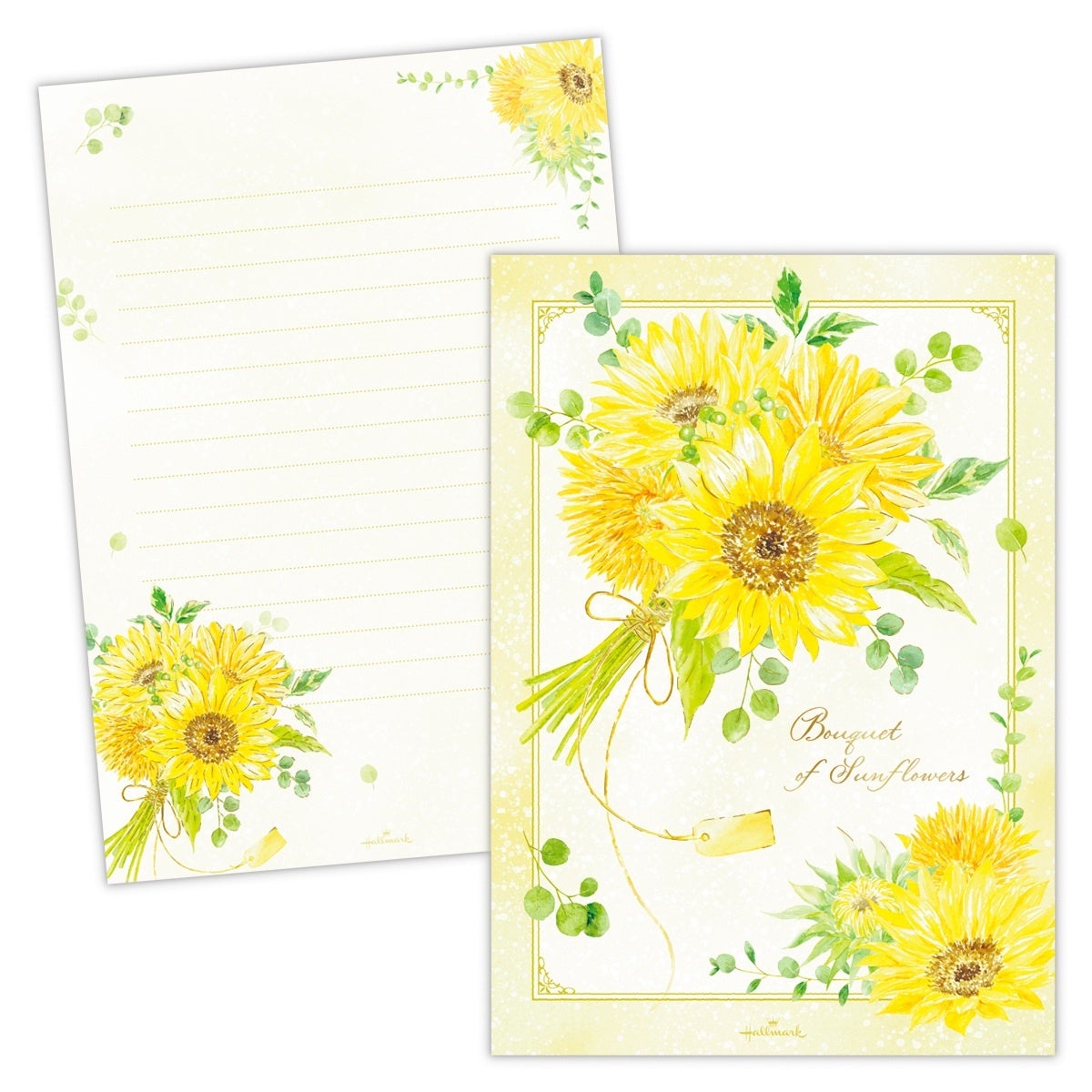 注目のミニひまわりのブーケを取り入れたデザイン。小ぶりながら元気いっぱいに咲くミニひまわりを、ナチュラルで優しいタッチで表現しました。やわらかなベージュの背景に、鮮やかなイエローが美しく映えます。