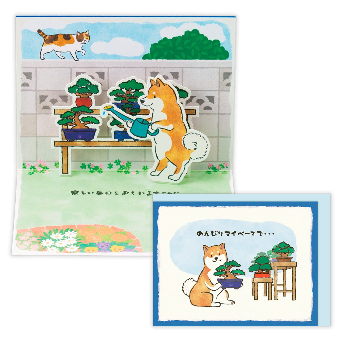 昔懐かしい昭和の風景を、可愛らしい表情と仕草の柴犬で表現した人気シリーズ。柴おとんが庭先の盆栽をお世話する様子を描いた、ほっこり癒されるデザインです。