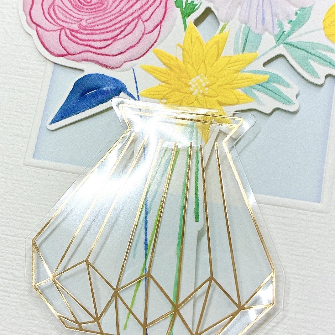 色とりどりの花々に透明素材の花瓶風アタッチメントを重ね、まるでインテリアのような上質なデザインに仕上げました。クリアな花瓶が初夏にぴったりの清涼感を演出します。