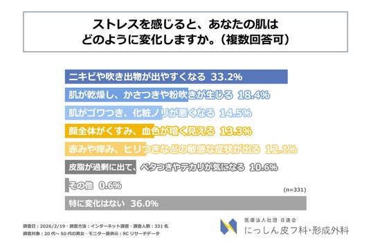 また、20代~50代の男女を対象に「ストレスを感じると、自身の肌はどのように変化するか」を尋ねる設問への回答では、1位が「ニキビや吹き出物が出やすくなる」で33.2%、2位が「肌が乾燥し、かさつきや粉吹きが生じる」で18.4%、3位が「肌がゴワつき、化粧ノリが悪くなる」で14.5%という結果になりました。「特に変化はない」という回答が最多である一方、ストレスを感じると自身の肌に現れる変化は主に、「ニキビや吹き出物が出やすくなること」や「肌が乾燥し、かさつきや粉吹きが生じること」であることが判明しました。