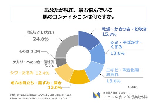 続いて、20代~50代の男女を対象に「現在、最も悩んでいる肌のコンディションは何か」を尋ねる設問への回答では、1位が「悩んでいない」で24.8%、2位が「乾燥・かさつき・粉吹き」で15.7%、3位が同率で「シミ・そばかす・くすみ」と「ニキビ・吹き出物・肌荒れ」で13.6%という結果になりました。この結果から、「悩んでいない」という回答が最多である一方、20代~50代の男女が現在、最も悩んでいる肌のコンディションは「乾燥・かさつき・粉吹き」であることがわかりました。
