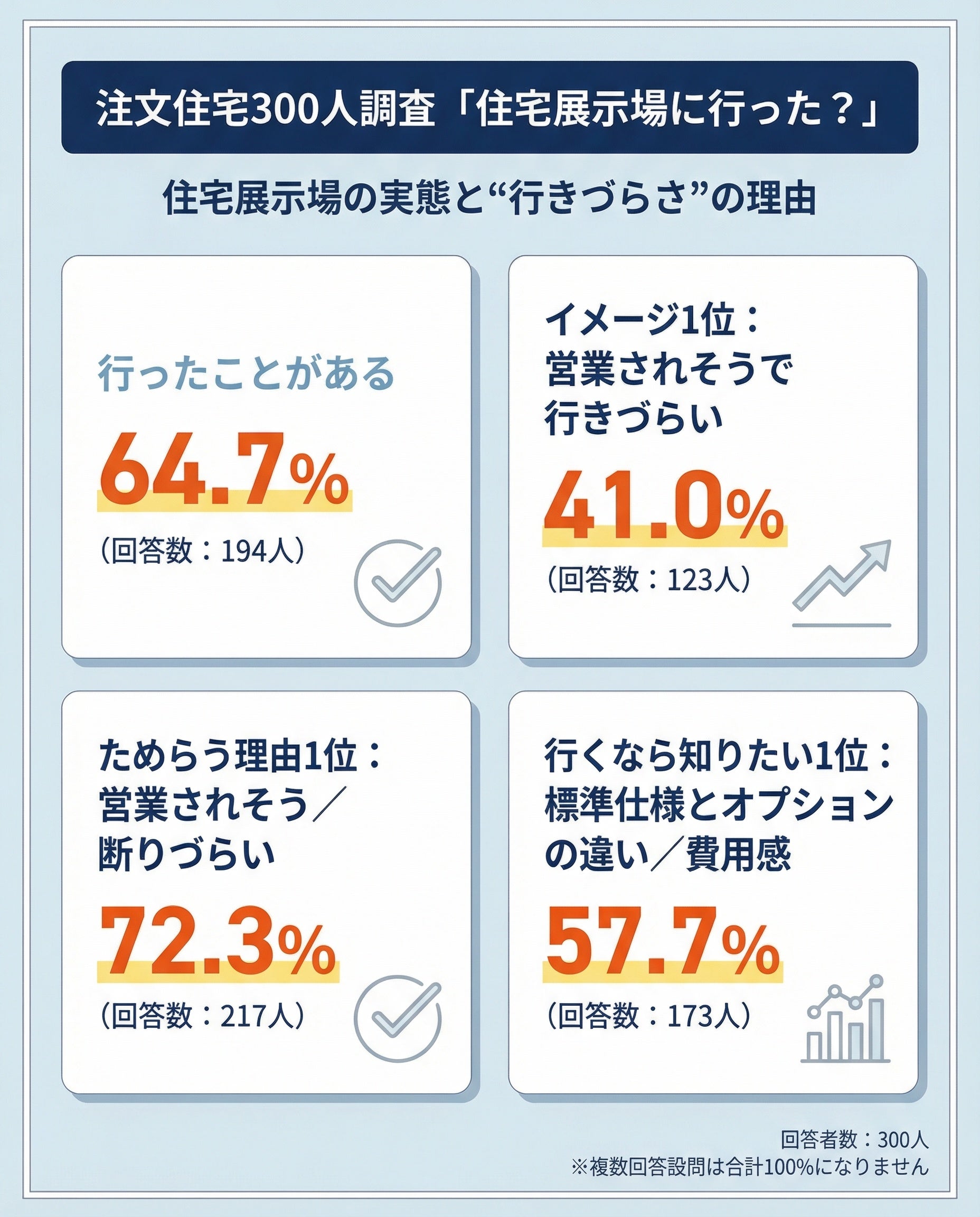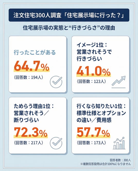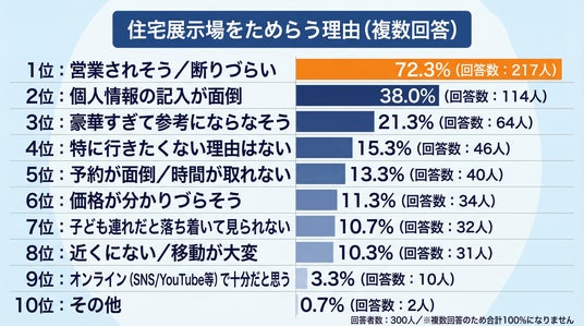 注文住宅300人調査:住宅展示場をためらう理由1位は営業されそう/断りづらい72.3%(217人)――行くなら知りたいのは標準仕様とオプションの違い/費用感57.7%(173人)