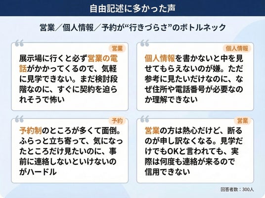 自由記述から見えてくるのは、展示場に行くこと自体が既に小さなコミットメントとして受け取られている現実です。