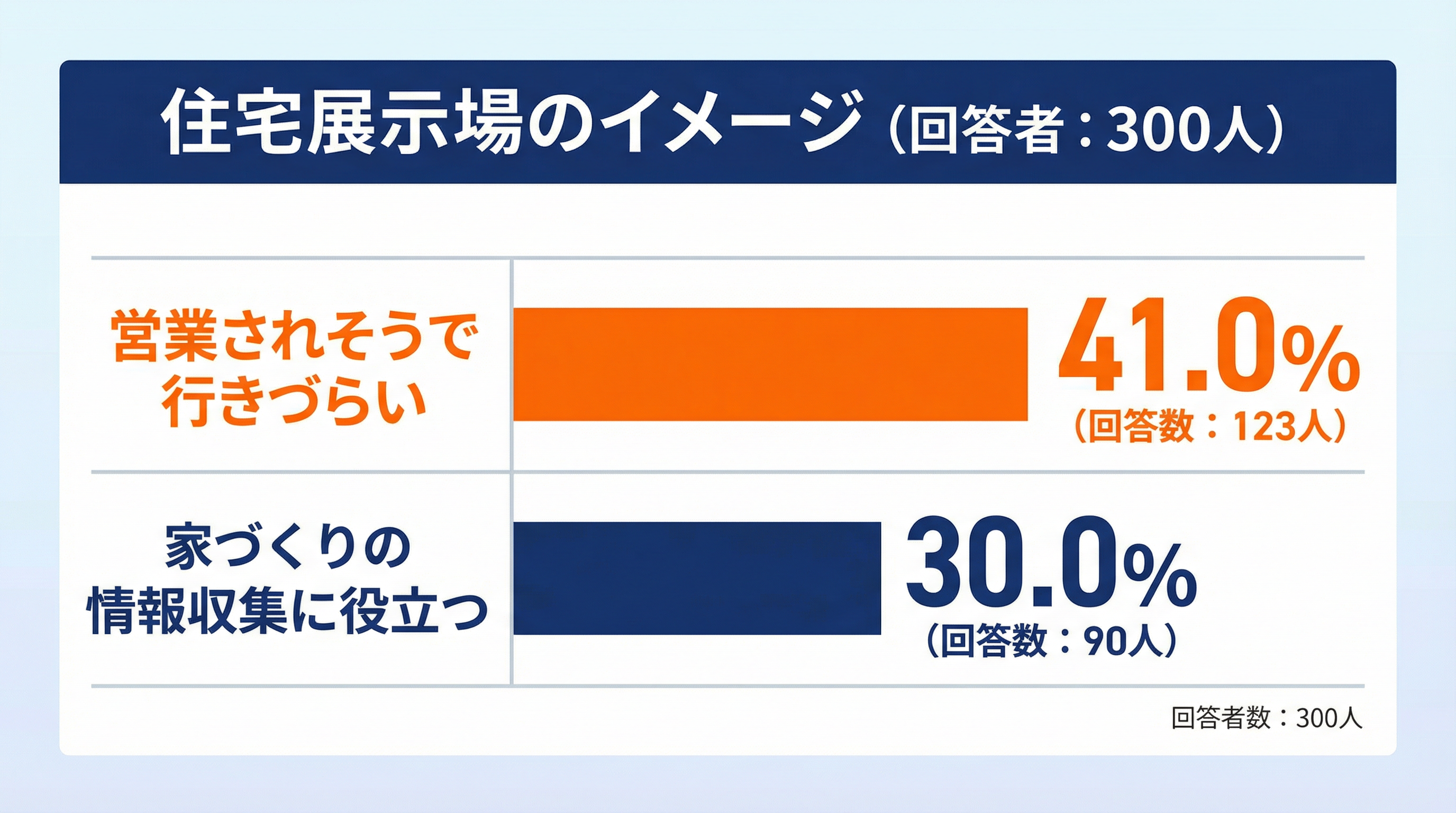 注文住宅に関心がある人にとって、住宅展示場は情報収集の場として一定の価値がある一方で、営業されそう/断りづらいという不安が最大のブレーキになっていることが分かりました。