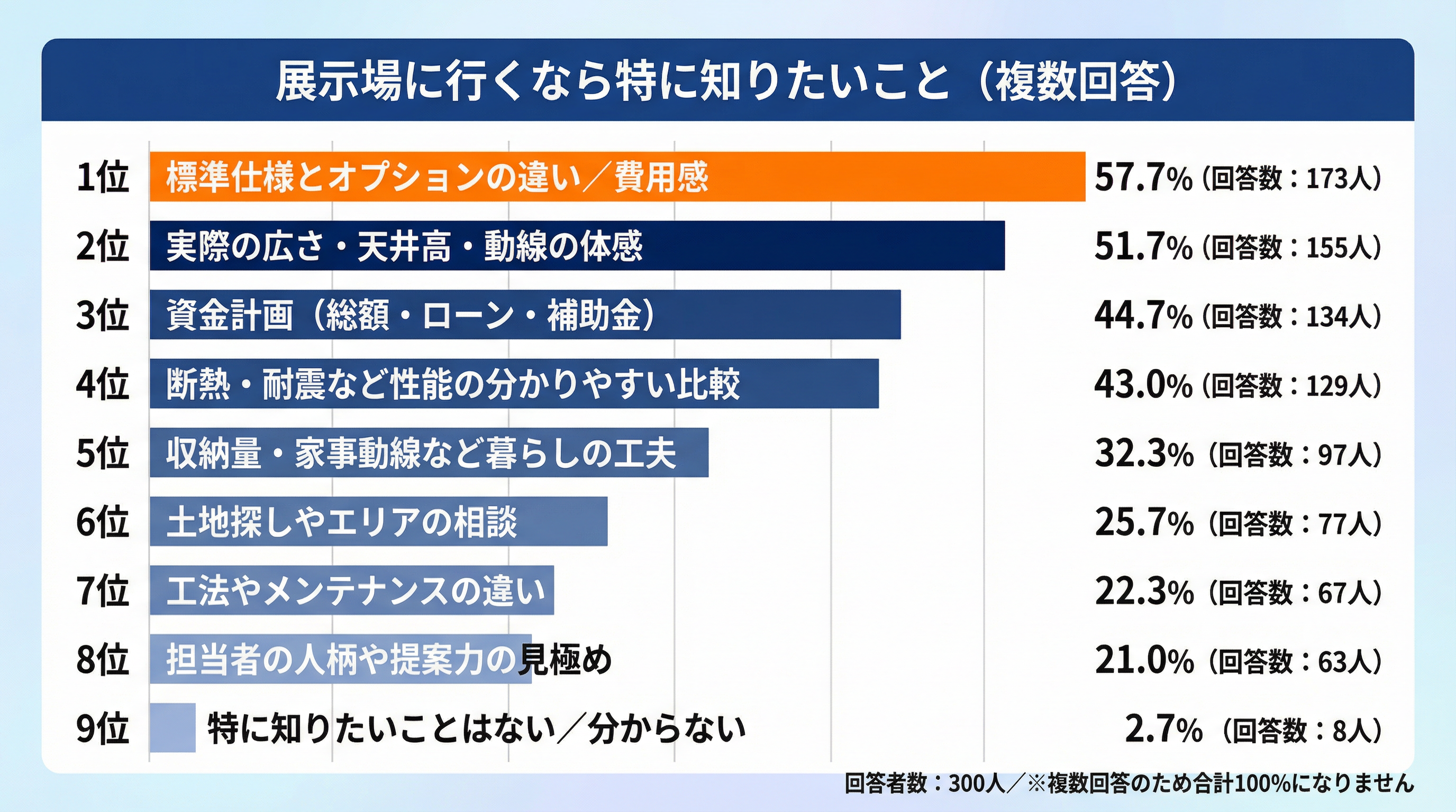 展示場で得たい情報は雰囲気よりも、総額感・仕様差・体感といった判断材料に集中していることが分かります。