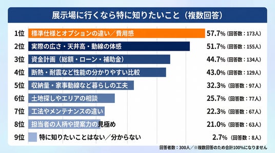 住宅展示場に行くなら、特に知りたいことを聞くと(複数回答)、最も多かったのは標準仕様とオプションの違い/費用感57.7%(173人)でした。